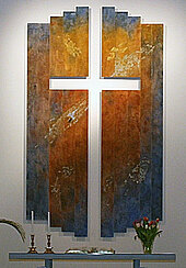 Korset är samtidigt ett uppståndelsekors som sammanbinder jordelivet från altarbordet, upp till himlen.
